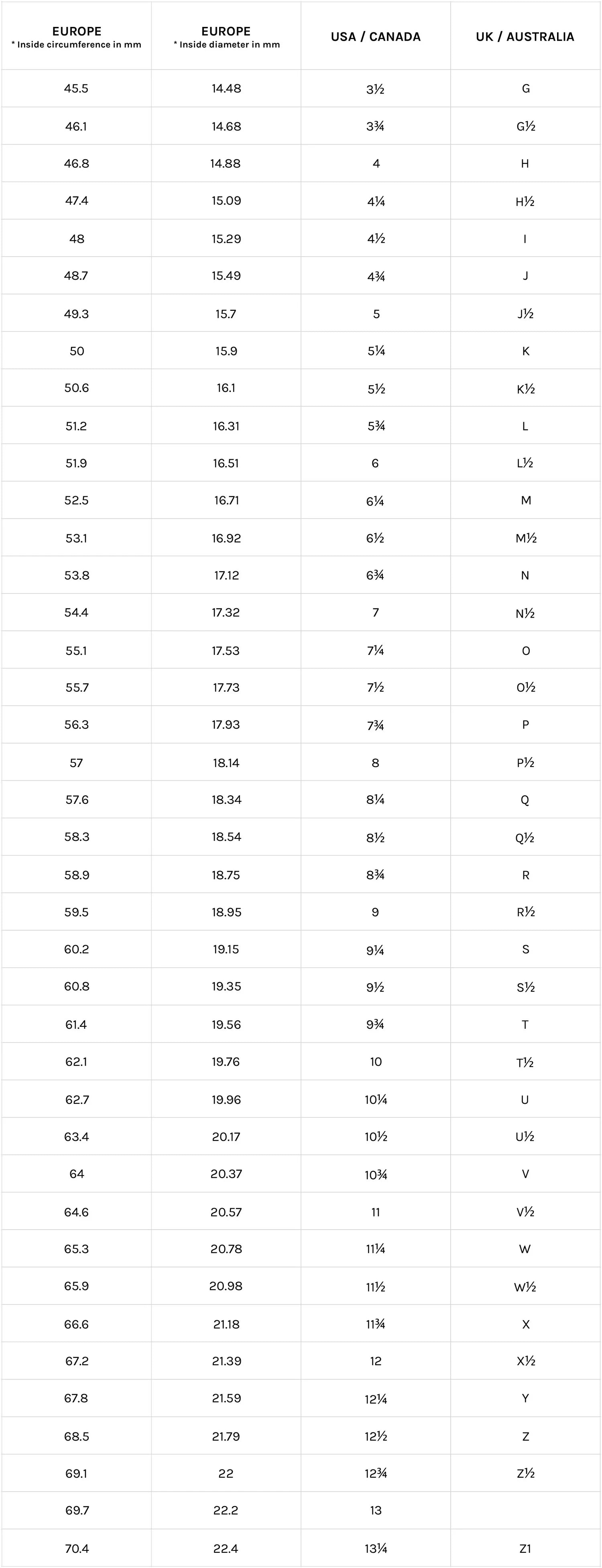 *E.g., if your usual size is 55 (European scale = inner circumference), then for a narrow ring like Little Fox you would typically stay with size 55. For a wider ring like Joker, it is advisable to go up by one full size — in this case, size 56. - OPEN RINGS ARE ADJUSTABLE